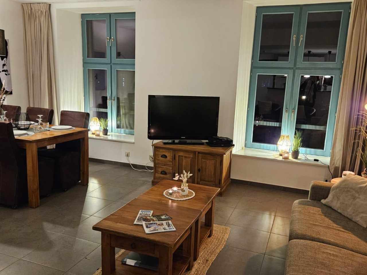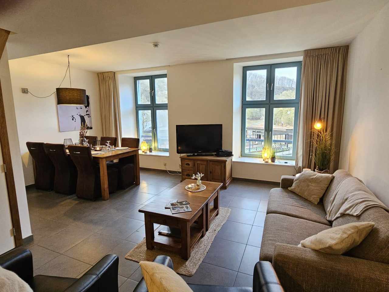- Salon confortable avec fauteuils en cuir, feu ouvert, TV et chaîne HIFI